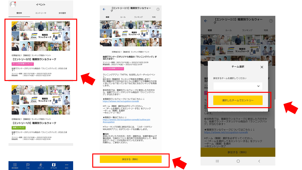 アプリTOP画面の下部に表示されるイベントから「【エントリー2/2】職業別ラン&ウォーク」を選択し、参加するボタンをタップします。職業を選択すると、エントリー完了となります。