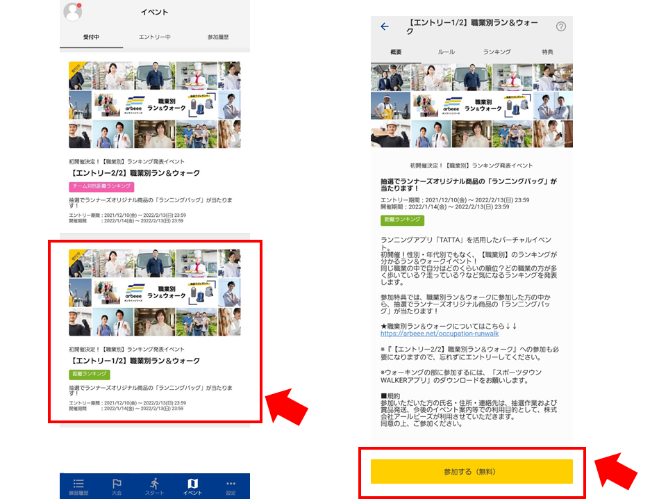 アプリTOP画面の下部に表示されるイベントから「【エントリー1/2】職業別ラン&ウォーク」を選択し、参加するボタンをタップします。