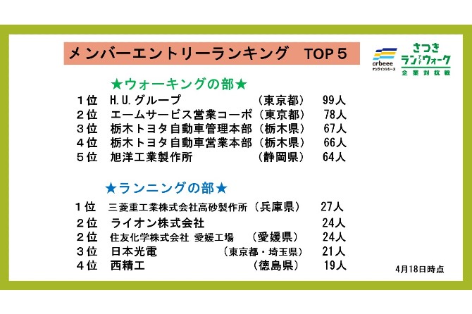 4月18日(月)時点でウォーキングの部4,092名、ランニングの部1,294名、計5,386名のメンバーエントリーしています。