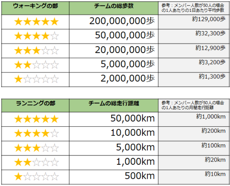 今年の大会は昨年から表彰基準が変更となり、チームの総歩数・総走行距離にて5つ星表彰を行います。