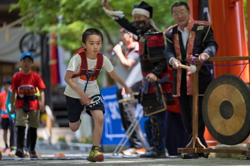 スタートは10秒毎に一人ずつ。それぞれ名前を呼ばれ、真田幸村に扮するスターターが振り上げる采配を合図にスタート。同時に銅鑼が打ち鳴らされます。