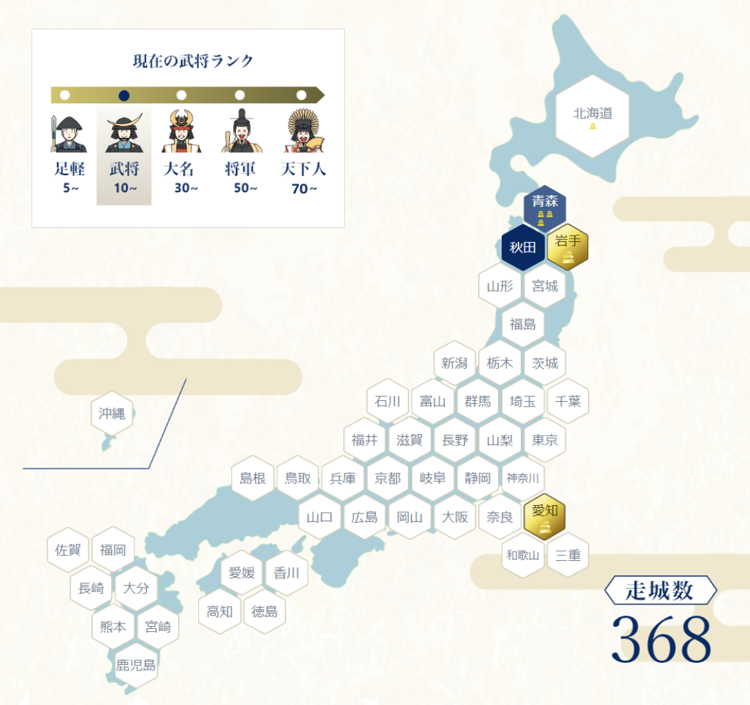 また、通算走城数に応じて「武将ランク」も表示されています。認定大会を走れば走るほど出世し、70大会走城で天下人に! 全国の認定大会を走って地図を塗りつぶし、立身出世していくのを楽しみましょう。