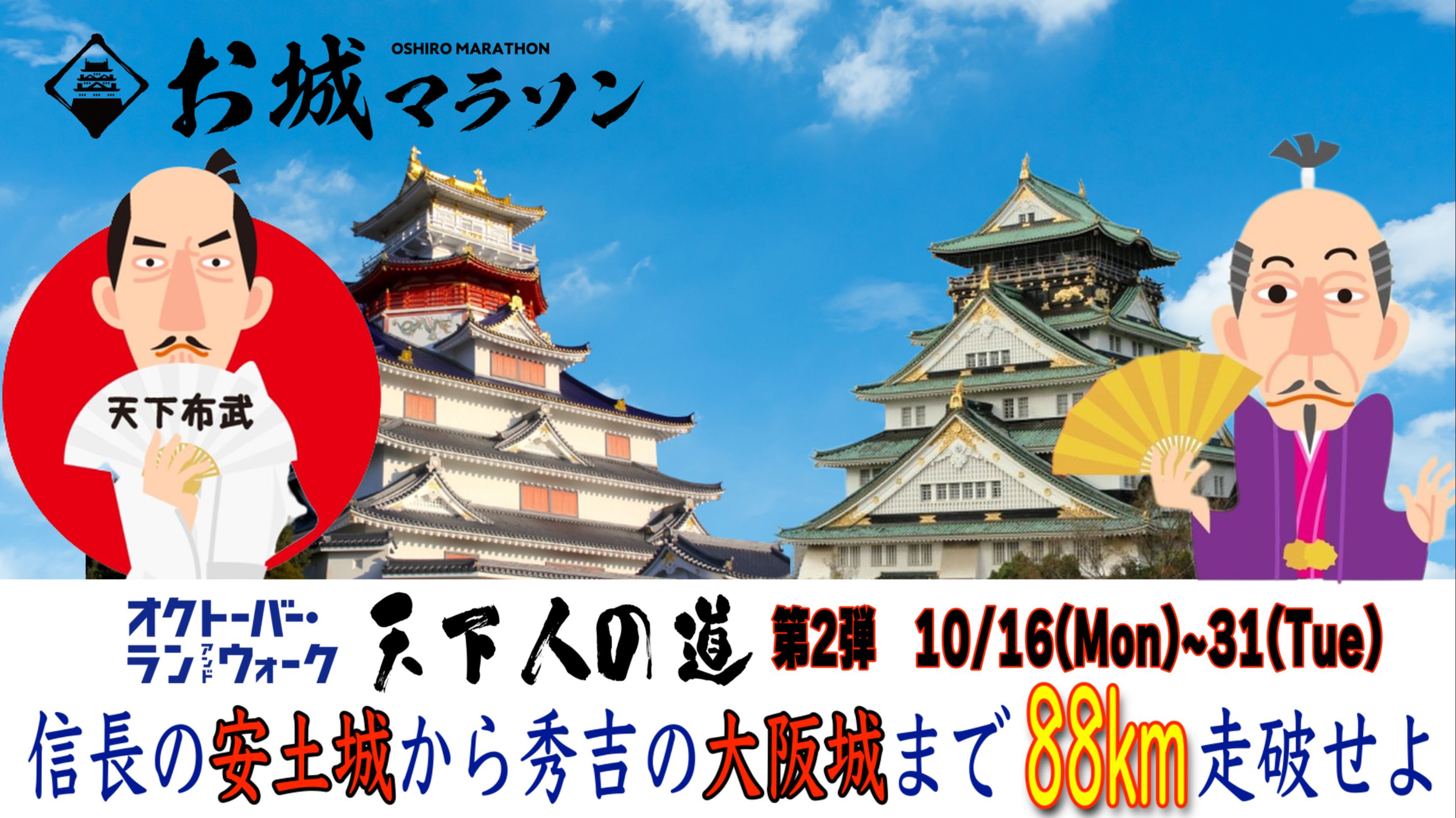 本日10月16日0:00から始まったのは「信長の安土城から秀吉の大阪城まで88kmを走破せよ」今月31日まで16日間のチャレンジです。