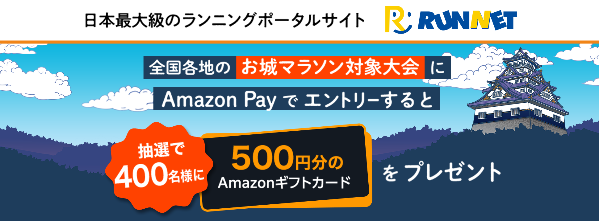 キャンペーン期間中に「お城マラソン」の対象大会(約50大会)にエントリーすると、抽選で400名様に500円分のAmazonギフトカードをプレゼントいたします。 ※Amazon Payでお支払いした方が対象です。キャンペーン期間