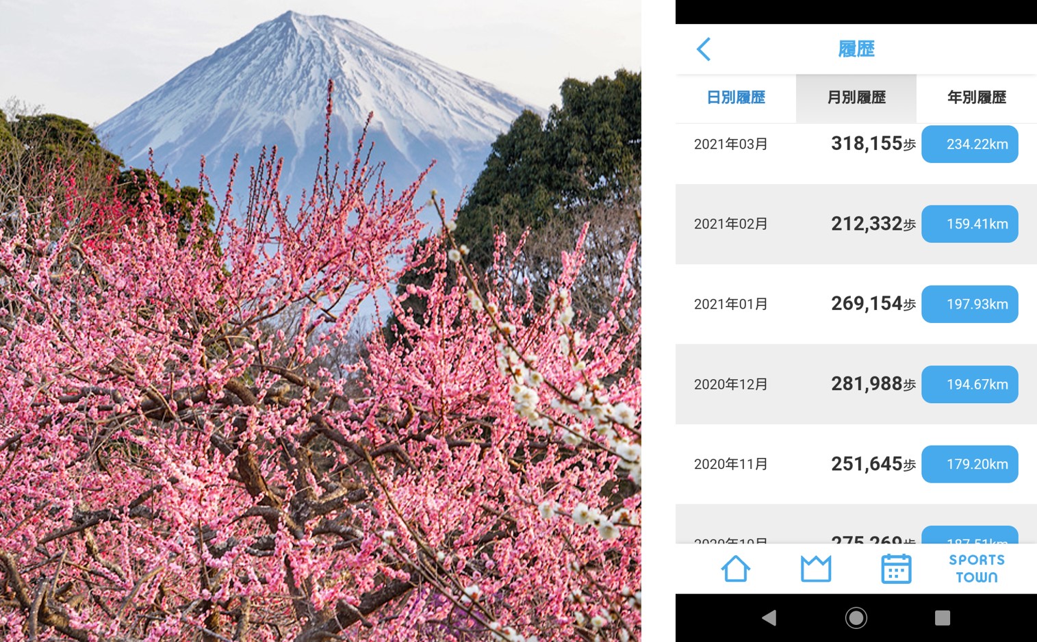 「春、みーつけたウォーク」の参加者から投稿いただいた写真。「履歴を見る」画面から過去の歩数をチェック可能。最高歩数に挑戦したり、月あたりの最高距離に挑戦するなど目標設定はあなた次第