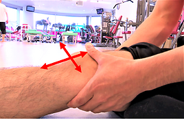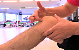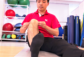 「脂肪組織は、ヒザのお皿の下の膨らみの部分です。ヒザを伸ばすと膨らみ、曲げると、関節内の空間に引っ込みます。この脂肪自体を、指の腹で軽く圧迫しながらほぐします」