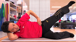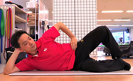 横に寝て、手をついて上体を起こす。両ヒザを90度に曲げる。この状態から、上側の脚を貝殻(シェル)を開くように開閉。開いて3秒キープし、ゆっくり戻す。左右とも行う。骨盤の奥で、脚の骨と繋がる外旋筋に効く。慣れてきたら、両脚のモモにチューブを巻いて、負荷を高めよう。