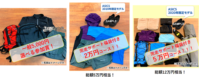 エントリー時には参加費・参加賞によって一般コース・2万円コース・5万円コースの3つのコースから選択が可能で、今後のランニングライフに欠かせないグッズが盛りだくさんです。今後のランニングが、より充実したものになること間違いなしです。