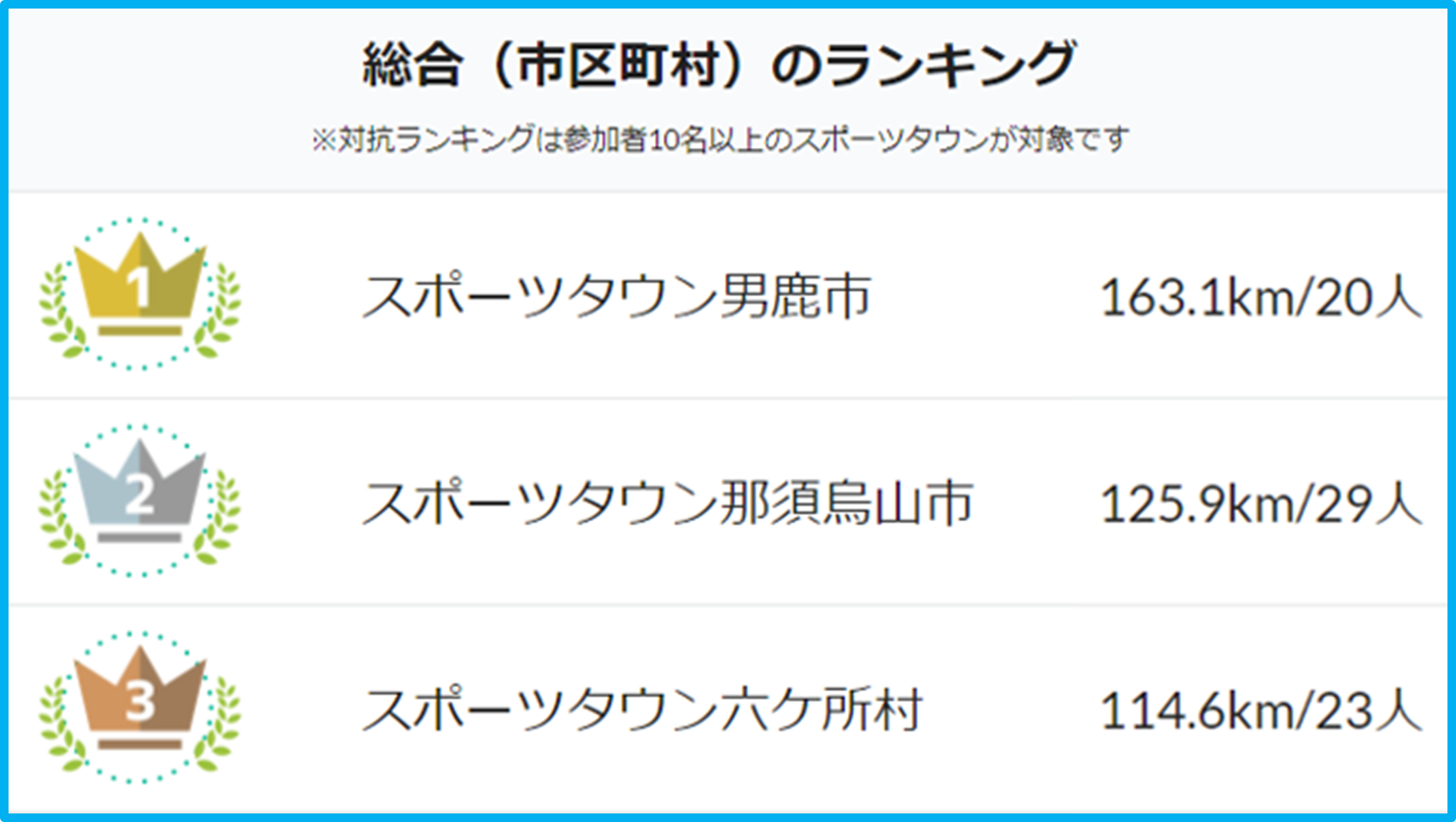 トップの男鹿市は先週の速報からさらに2位以下を引き離しており、”日本一走るまち”の栄冠に向かって順調に距離を積み重ねています。他の自治体は、ここからの追い上げとなるでしょうか。