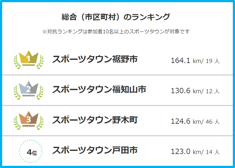 『オクトーバー・ラン&ウォーク』開催から3週間が経ち、今年から初開催の「全国スポーツタウン対抗戦」では、これまで目まぐるしく順位が入れ替わる展開となっています。全国137の自治体にお住まいの参加者の平均歩行距離を集計し、“日本一歩くまち”が決まります。今回は、ウォーキングの部「全国スポーツタウン対抗戦」10月21日(水)時点のランキングをご紹介します。