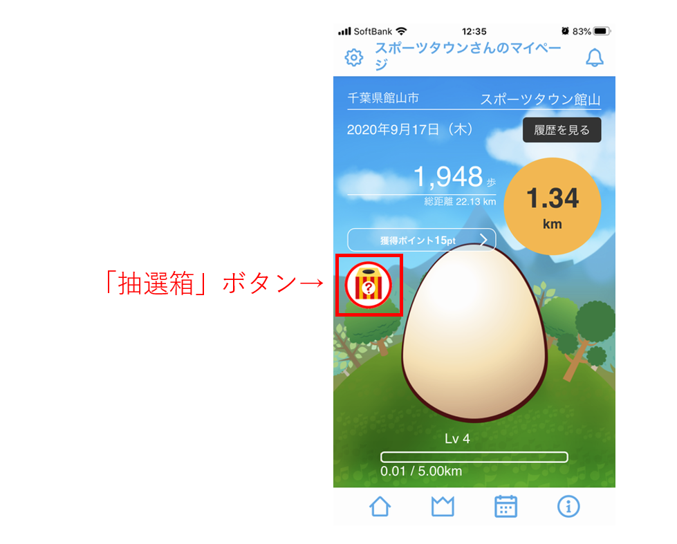 ②「スポーツタウンWALKER」を起動、TOPページの「抽選箱」ボタンをタップ