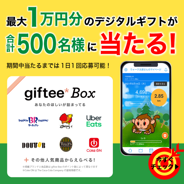 今年は参加特典として、最大1万円分のデジタルギフト(ギフティボックス※)が合計500名様に当たるキャンペーンを「さつきラン&ウォーク2022 企業対抗戦」の開催期間(5/1~5/31)、毎日実施します。期間中当たるまでは1日1回応募可能です!